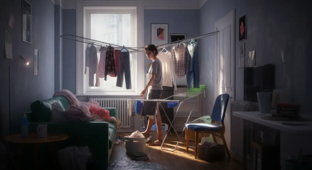 Small flats fill up with moisture quickly. When you dry indoors without good airflow, the air can feel heavy and damp. That not only makes clothes smell musty, it can also affect the walls and windows.